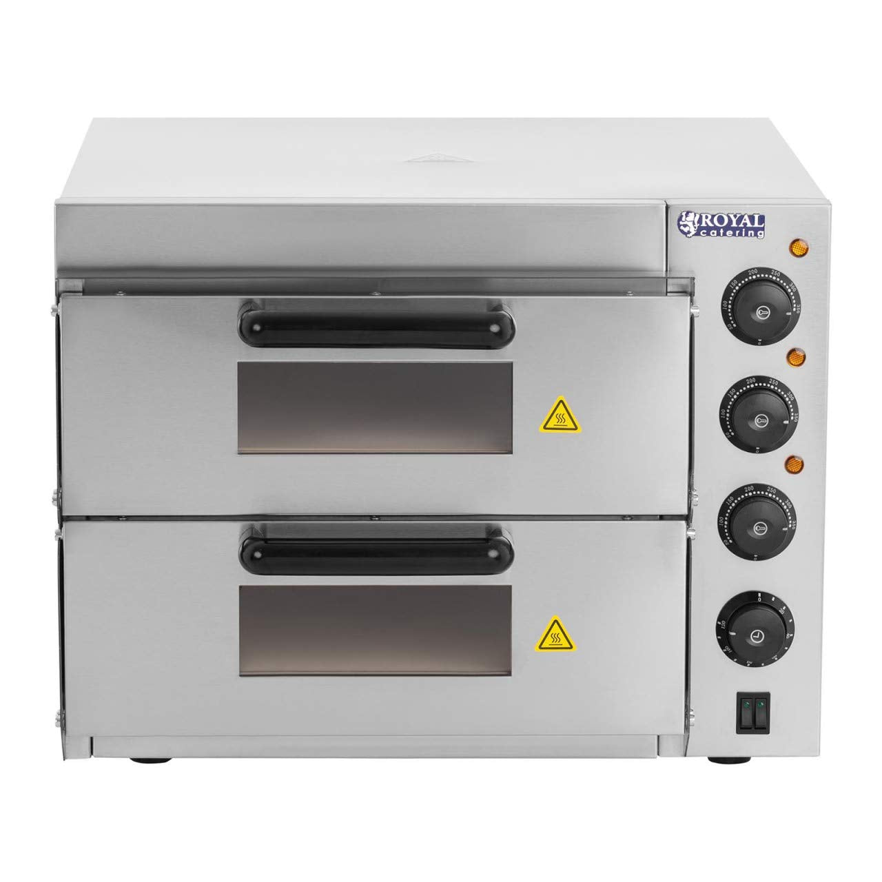 Royal Catering RCPO-3000-2PS-1 Pizzaofen elektrisch 2 Kammern Pizzabackofen Pizza Ofen Schamotte Schamotteboden (3000W, 2 Schamotte-Steinböden: 40 x 40 x 1,5 cm, Timer bis 120 min, Edelstahl)